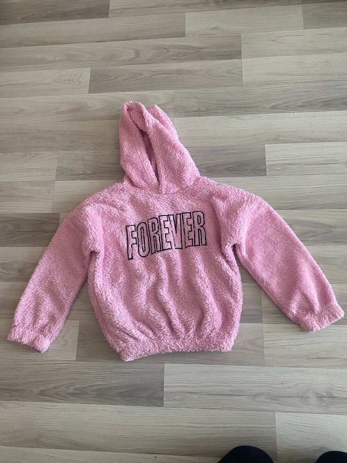 Pembe kapüşonlu, uzun kollu, bol kesim kız çocuk sweatshirtü. Yumuşak, kürk detaylı kumaştan ve "FOREVER" baskılıdır. Görselde görüldüğü gibi kol kısımlarında hafif yıpranma mevcuttur .9 yaş yazıyor fakat kalıbı küçüktür biz 6/7 yaş gibi kullandık