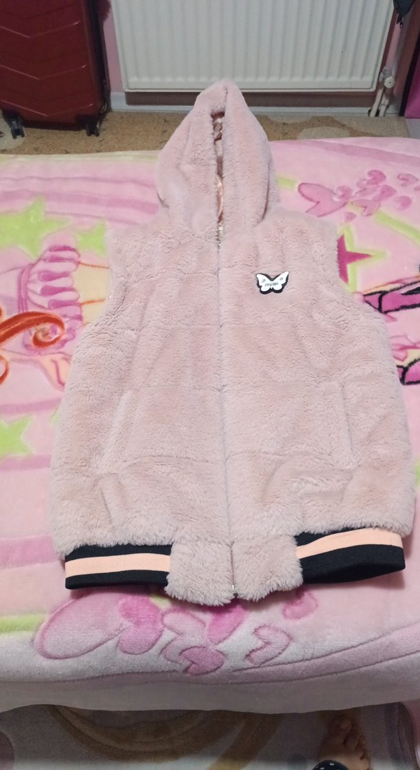 Kapüşonlu, yumuşak peluş kumaştan yapılmış, kolsuz ve bol kesim pembe yelek. Göğüste kelebek detaylı ve etek kısmında çizgili şerit bulunur. sıcacik tutar çok şik cok severek kullandiğimiz bir ürün fakat artık küçük geliyor