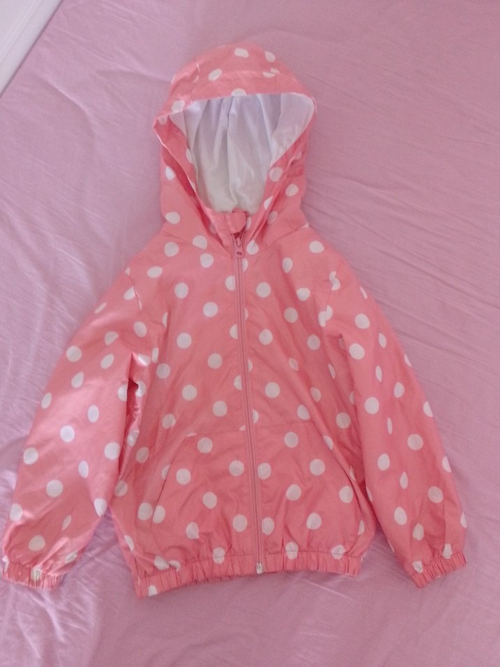 Kız çocukları için kapüşonlu ve fermuarlı, pembe renkli beyaz puantiyeli, yumuşak ve sıcak kumaştan yapılmış dar kesim yağmurluk. ️