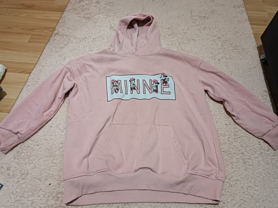 Pembe renkte, kapüşonlu ve uzun kollu kız çocuk sweatshirtü. "MINNE" baskısı ve fırfır detayları vardır, yumuşak ve sıcak kumaştan üretilmiştir.