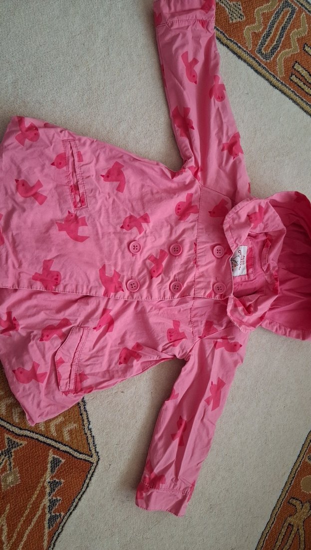 Pembe kapüşonlu kız çocuk yağmurluğu, düğmeli ön kısmı ve bol kesimi ile rahat bir kullanım sunar. Renkli kuş desenleri mevcuttur. ️