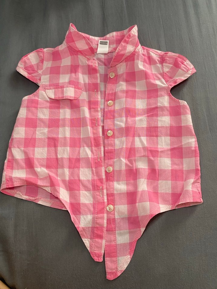 Pembe pastel kareli, kısa kollu ve düğmeli, yakalı, pamuklu, salaş kesim kız çocuk gömleği. Sokak stiline uygun rahat model.