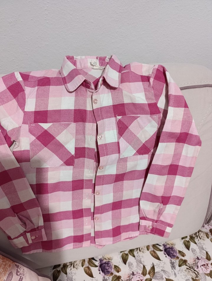 Kız çocukları için pastel pembe kareli, pamuklu, uzun kollu, düğmeli ve yakalı gömlek. Rahat ve günlük kullanıma uygun.