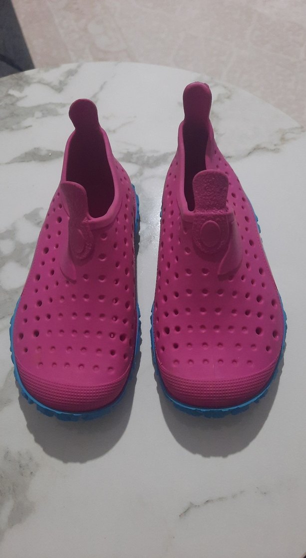 Pembe kauçuk kız çocuk terliği, sade tasarım ve .Üst kısmı delikli, mavi tabanlı, rahat ve kolay giyilir. sadece arkadaki aksesuar kopmuş ayakkabıya hiç bir zararı yoktur