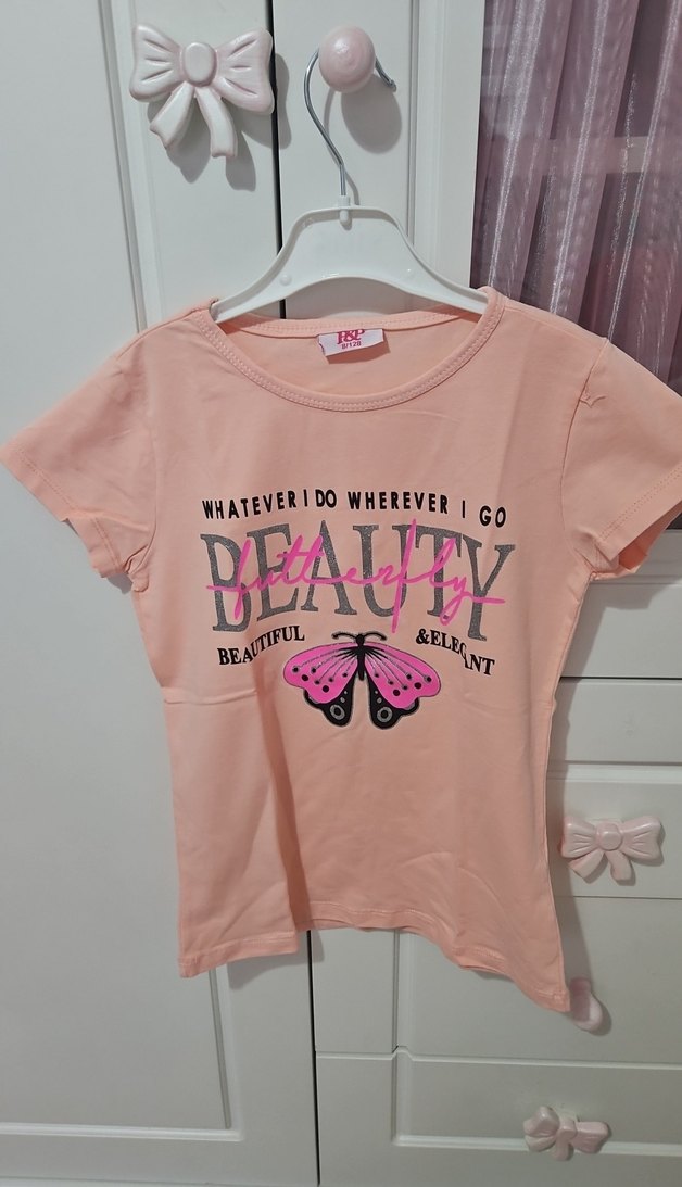Pamuklu, kısa kollu, bisiklet yaka, kelebek baskılı, kemerli pembe tişört. Trendy sokak stili için uygun.