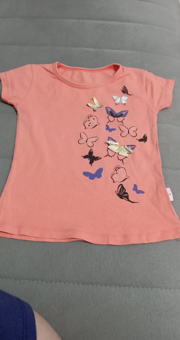 Pembe renkli kız çocuk tişörtü, bol kesim, kısa kollu ve yuvarlak yaka. Kelebek baskısı ve düğme detayları bulunur, yumuşak sentetik kumaştan yapılmıştır.