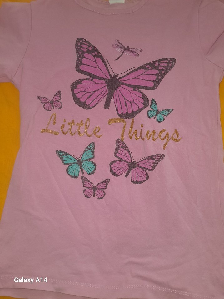 Pastel pembe renkli, uzun kollu ve bisiklet yaka kız çocuk tişörtü. Üzerinde kelebek baskısı ve "Little Things" yazısı bulunur, yumuşak kumaştan üretilmiştir.