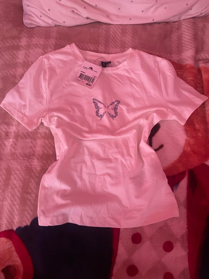 Dar kesim pembe kız çocuk tişörtü, kısa kollu ve yuvarlak yakalıdır. Kelebek baskısıyla süslenmiş, yumuşak kumaştan yapılmıştır. Trendy ve rahat bir tarz sunar.
