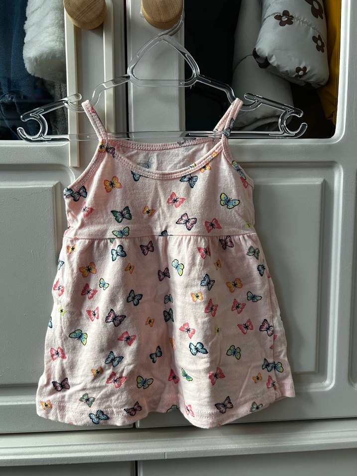 Askılı, kolsuz pembe elbise, kelebek desenli ve pileli detaylarla rahat ve bol kesim sunar. Yumuşak tekstil kumaştan yapılmıştır.