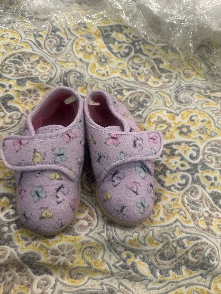 Kelebek desenli, yumuşak kumaştan yapılmış kız çocuk pembe sıcak panduf. Kolay giyimi sağlayan cırt cırtlı bant içerir.