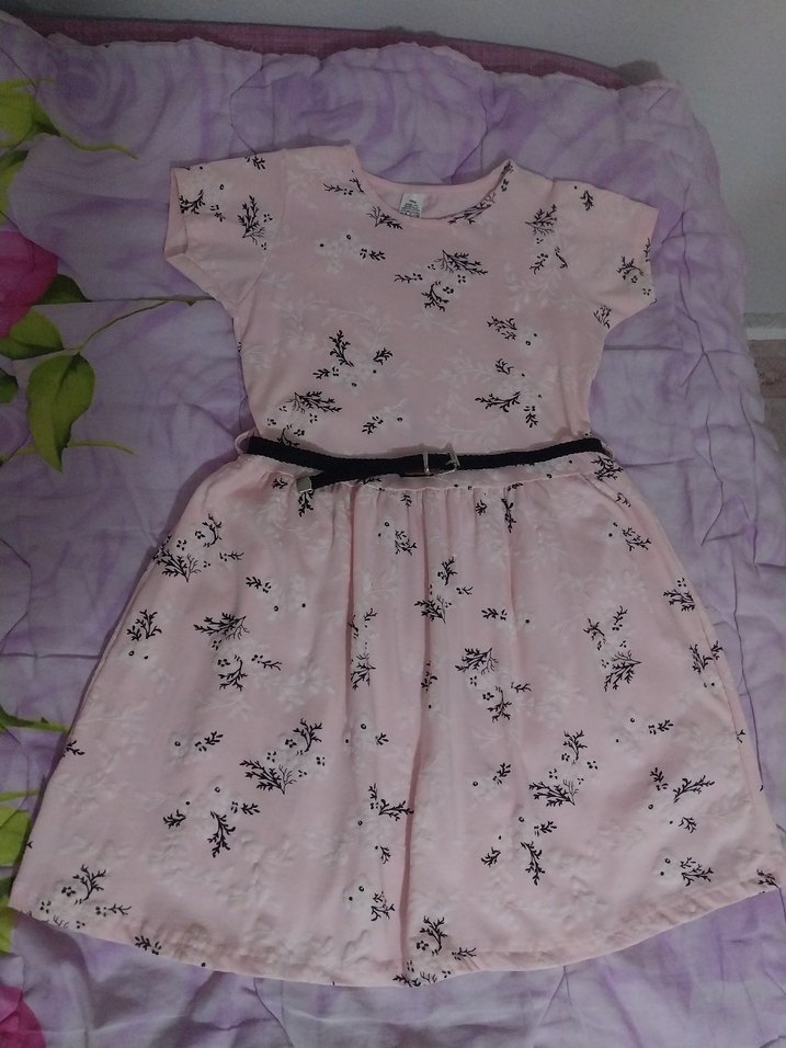 Pembe renk, kısa kollu, V yakalı, kemerli ve desenli kız çocuk elbisesi. Rahat kesimli, yumuşak sentetik kumaştan üretilmiştir. hediye geldi hiç kullanılmadı