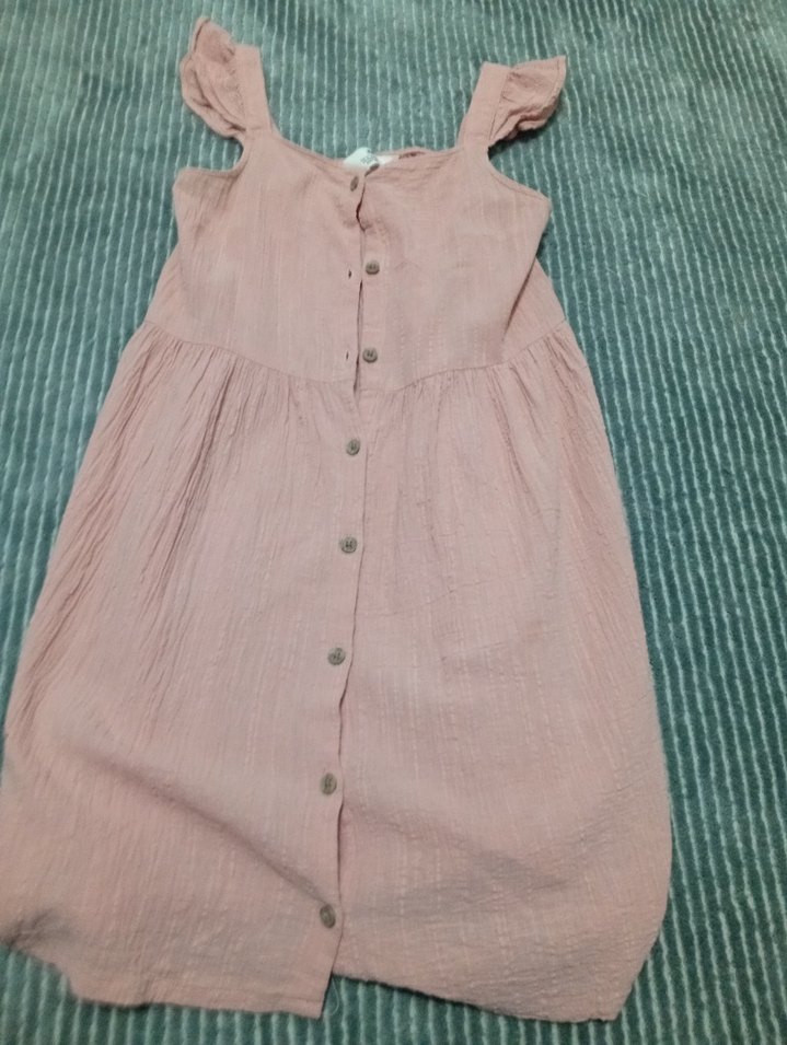 Pembe keten, düğmeli, askıli ve salaş kesim bohem tarzda kız çocuk elbisesi.