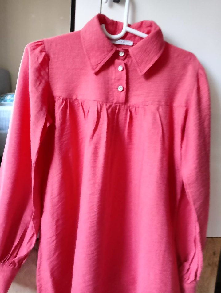 Kız çocuk pembe keten gömlek, uzun kollu, yakalı ve düğmeli detaylara sahiptir. Rahat kesimi ve pastel tonu ile sade bir tasarıma sahiptir.