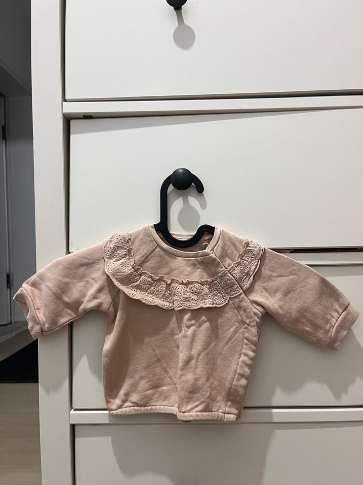 Pembe keten kumaştan, uzun kollu, yuvarlak yakalı, bol kesim kız çocuk bluzu. Fırfır detaylıdır.