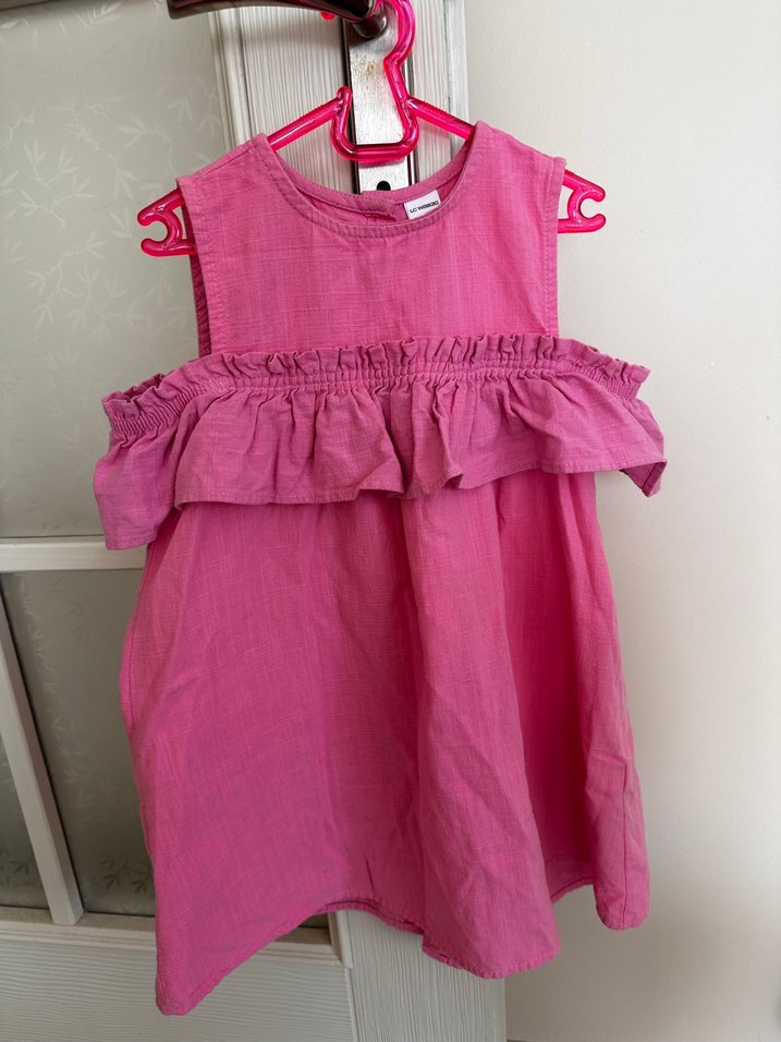 Pembe keten kumaştan, fırfırlı ve kolsuz, bol kesim kız çocuk elbisesi. Bohem tarzda ve şık görünüme sahip.