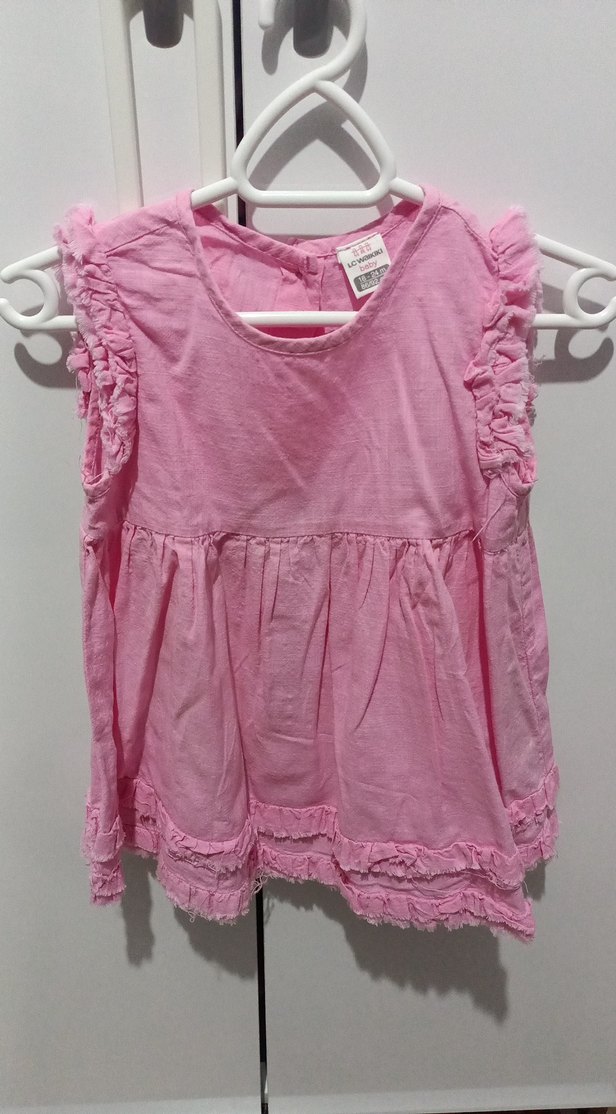 Pembe keten kumaştan, kolsuz, omuz ve etek kısmında fırfır detaylı bol kesim kız çocuk elbisesi. Yuvarlak yakalı sade bohem tarz.