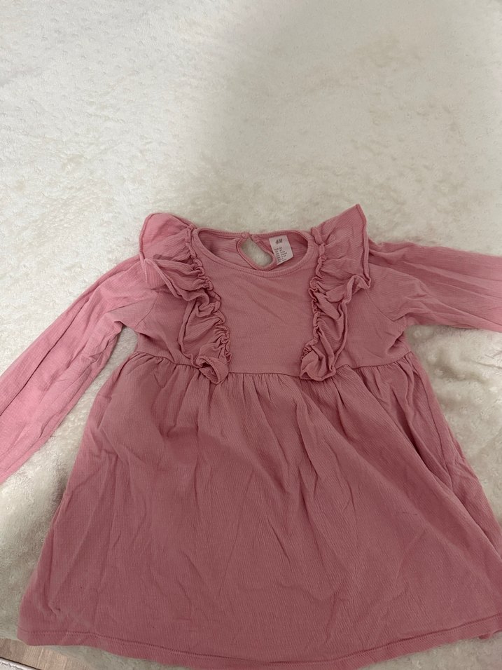 Pastel pembe keten kumaştan yapılmış kız çocuk elbisesi, uzun kollu ve fırfırlı detaylara sahip. Salaş kesimi ve düz tasarımıyla rahat bir modeldir.