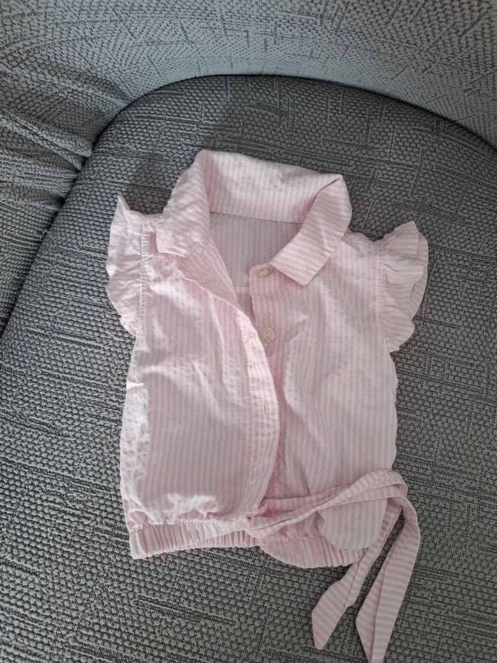 Keten kumaştan yapılmış, pembe pastel renkte, kısa kollu ve fırfırlı detaylı, yakalı ve bele bağlamalı kız çocuk gömleği.