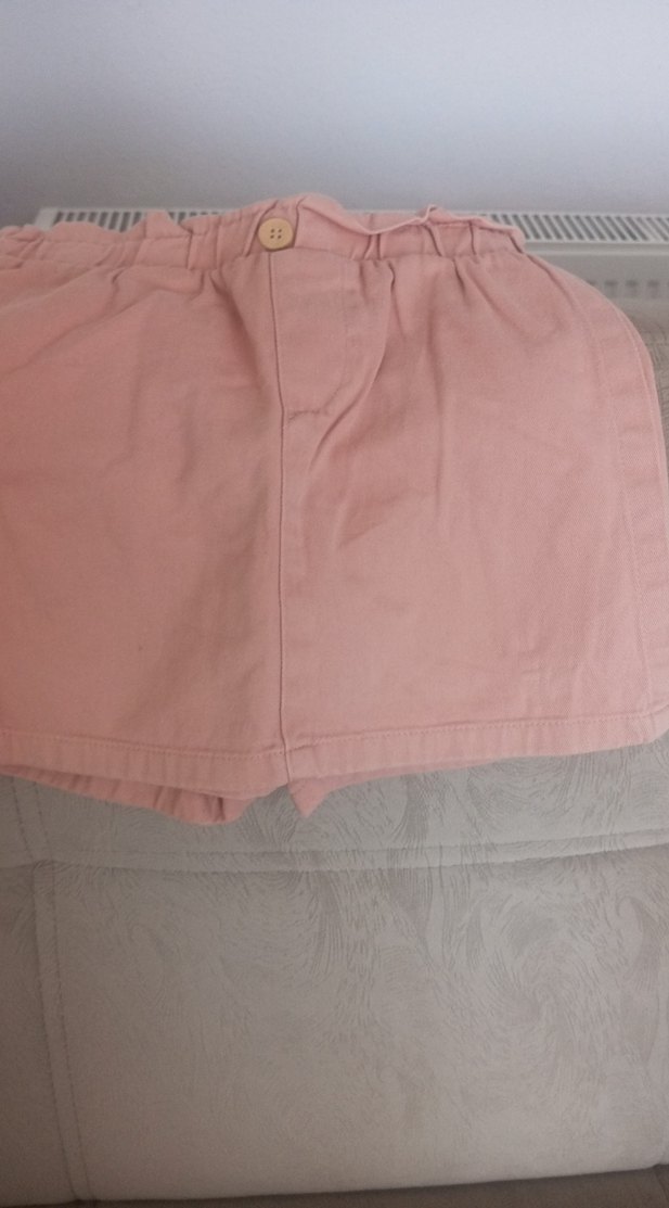 Kız çocuklar için düğmeli, keten kumaştan yapılmış, bol kesim pembe şort. Düz ve desensiz tasarım.