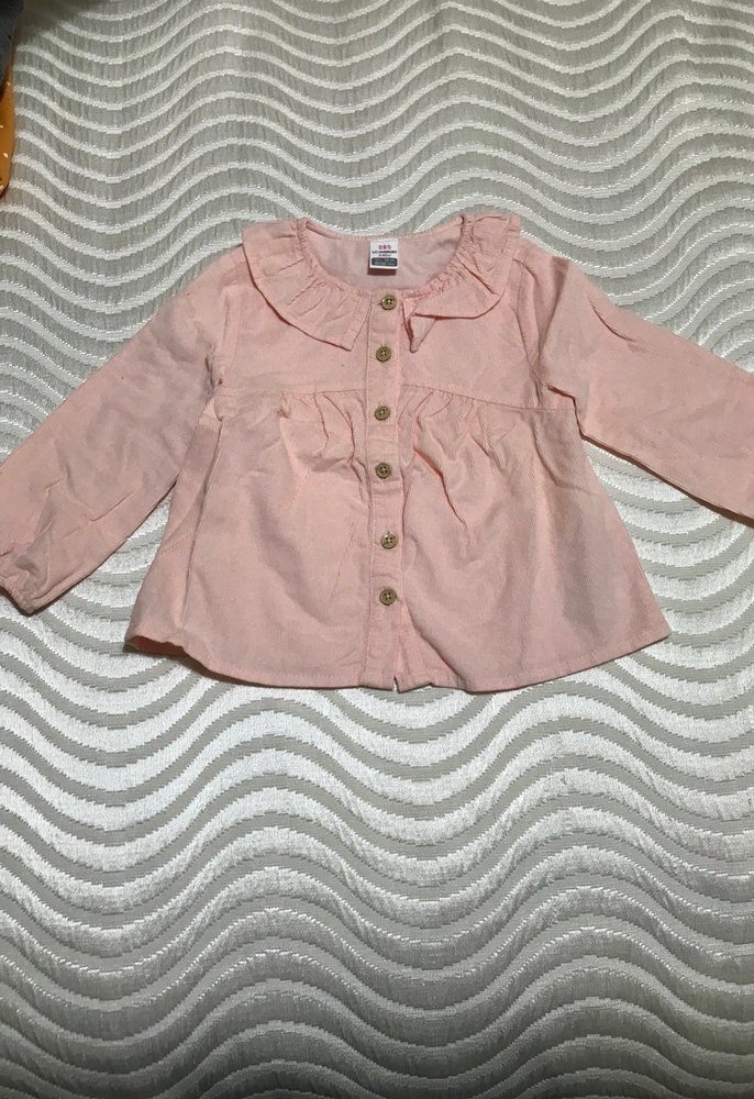 Pastel pembe renkli, uzun kollu, yakalı ve düğmeli kız çocuk gömleği. Yumuşak keten kumaştan, rahat ve bol kesim.