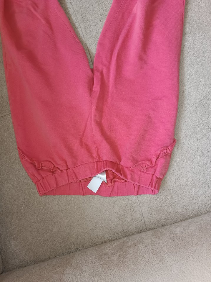 Bol kesim pembe keten kız çocuk pantolonu, etek ucunda volan detaylı, yumuşak ve rahat kullanım sağlar. Günlük sade tarz için uygun.