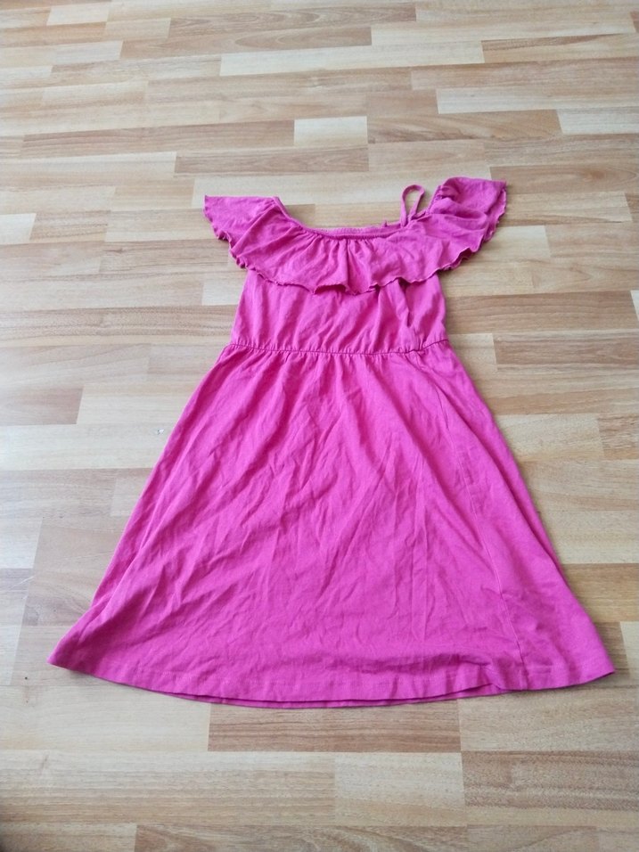 Keten kumaştan yapılmış, askısız yakalı ve volan detaylı pembe, bol kesim kız çocuk elbisesi. Bohem tarzda, renkli ve retro görünümlü.7-10 yaşa kadar Almanya markalı.
