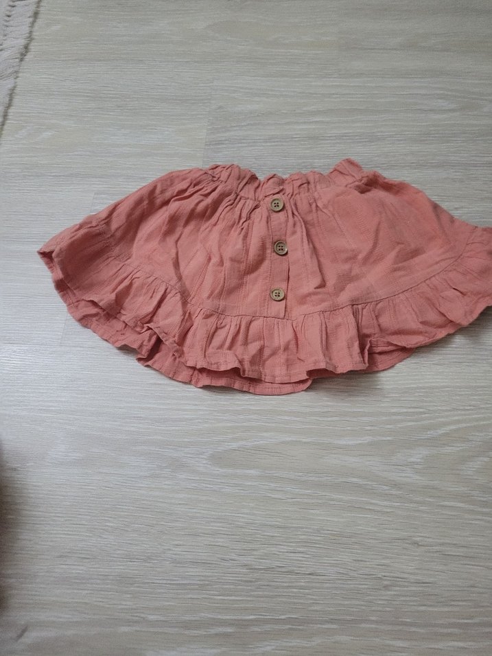 Pastel pembe renkli kız çocuk eteği, keten kumaştan, bol kesim ve volan detaylı, ahşap düğmelerle süslenmiş bohem tarzda.