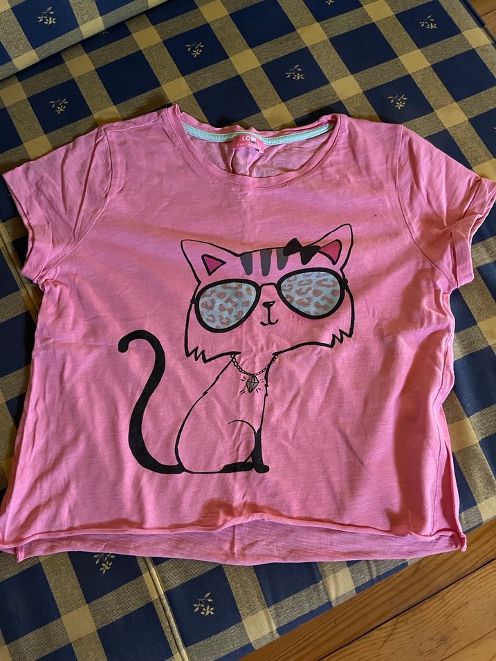 Pamuk kumaştan, bol kesim, kısa kollu pembe tişört. Üzerinde güneş gözlüğü takan kedi baskısı vardır. Bisiklet yaka ve sokak modası tarzındadır.