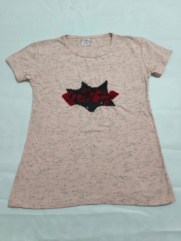 Kız çocukları için pembe, gri desenli, kısa kollu, yuvarlak yaka, baskılı ve örme dokulu sentetik kumaştan yapılmış bol kesim tişört.