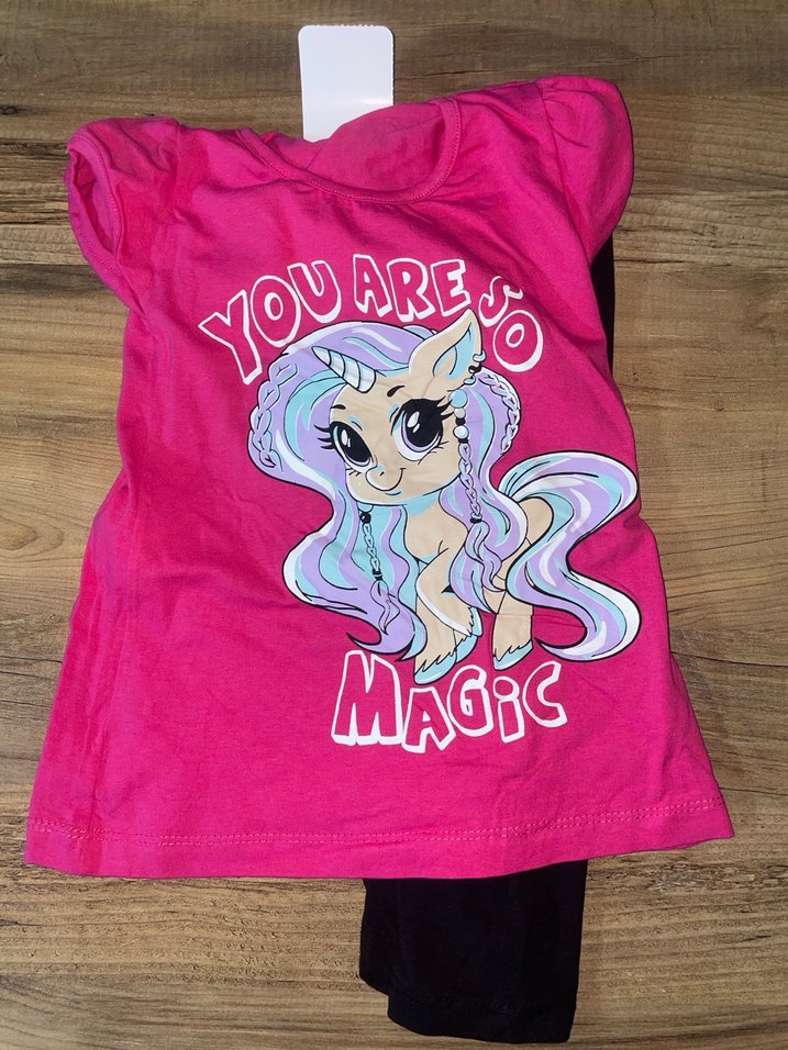 Kısa kollu, bisiklet yaka, pembe renkli kız çocuk tişörtü. Yumuşak sentetik kumaştan, parıltılı unicorn baskılı, trend günlük tarz için uygun.4-5 yaş.