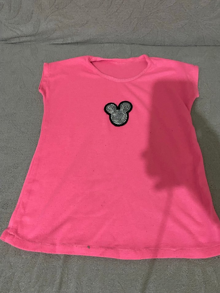 Pembe kısa kollu kız çocuk tişörtü, yuvarlak yaka ve renkli baskı detaylıdır. Gevşek kesim ve düğme detayına sahip, yumuşak sentetik kumaştan üretilmiştir.