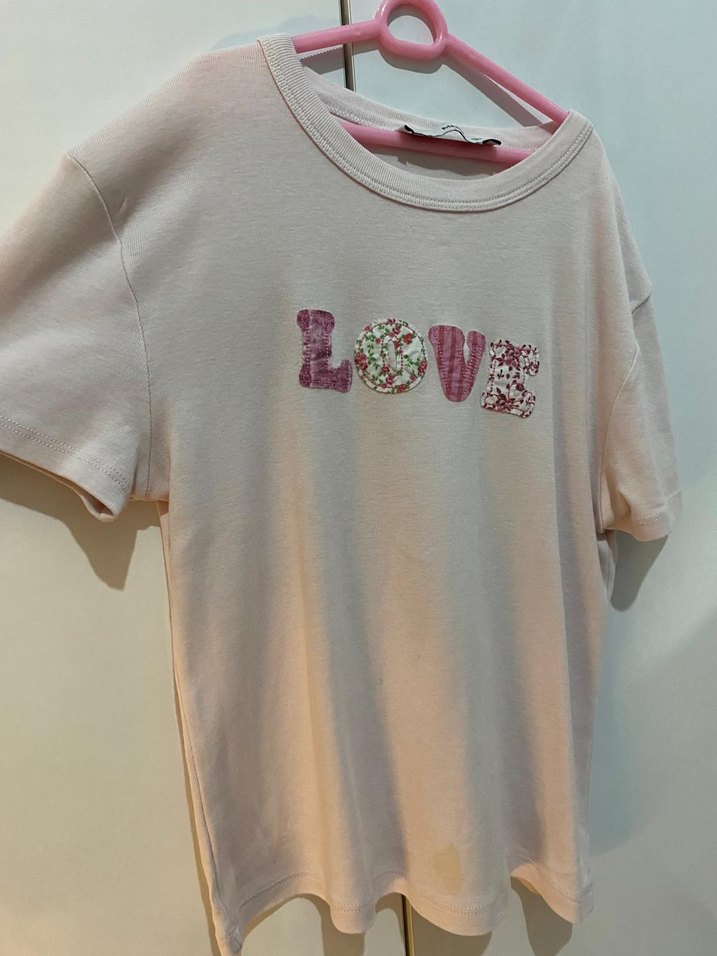 Pamuk kumaştan, bol kesim, kısa kollu, yuvarlak yakalı pembe tişört. Önünde 'LOVE' baskısı ve düğme detayları bulunur. Bohem ve retro tarz için uygun.