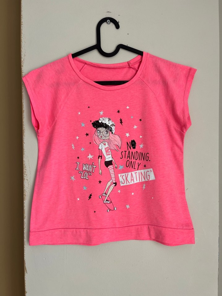 Pembe renkli, kısa kollu, bol kesim kız çocuk tişörtü. Üzerinde "No standing, only skating" ve "I want LOL" yazılı renkli baskı bulunur. Sentetik kumaştan, rahat ve şık sokak stili için uygundur. 10 yaş bedendir