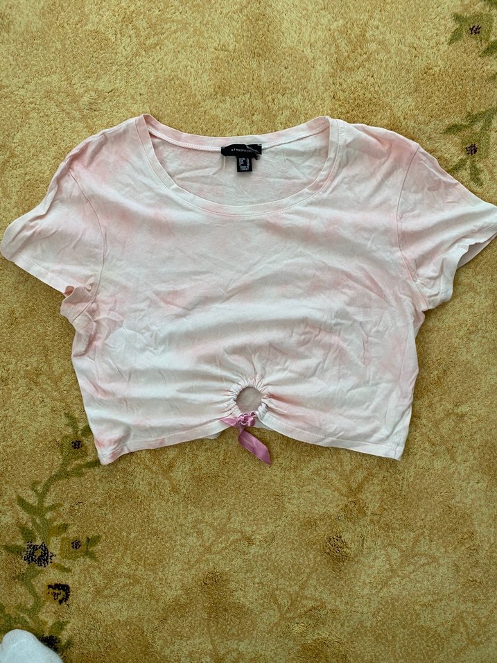 Kısa kollu, yuvarlak yakalı kız çocuk tişörtü, pamuklu ve rahat kesimdir. Pastel pembe batik desenli, ön kısmında şık bir büzgü detayı bulunur. Trend sokak stili için uygundur.