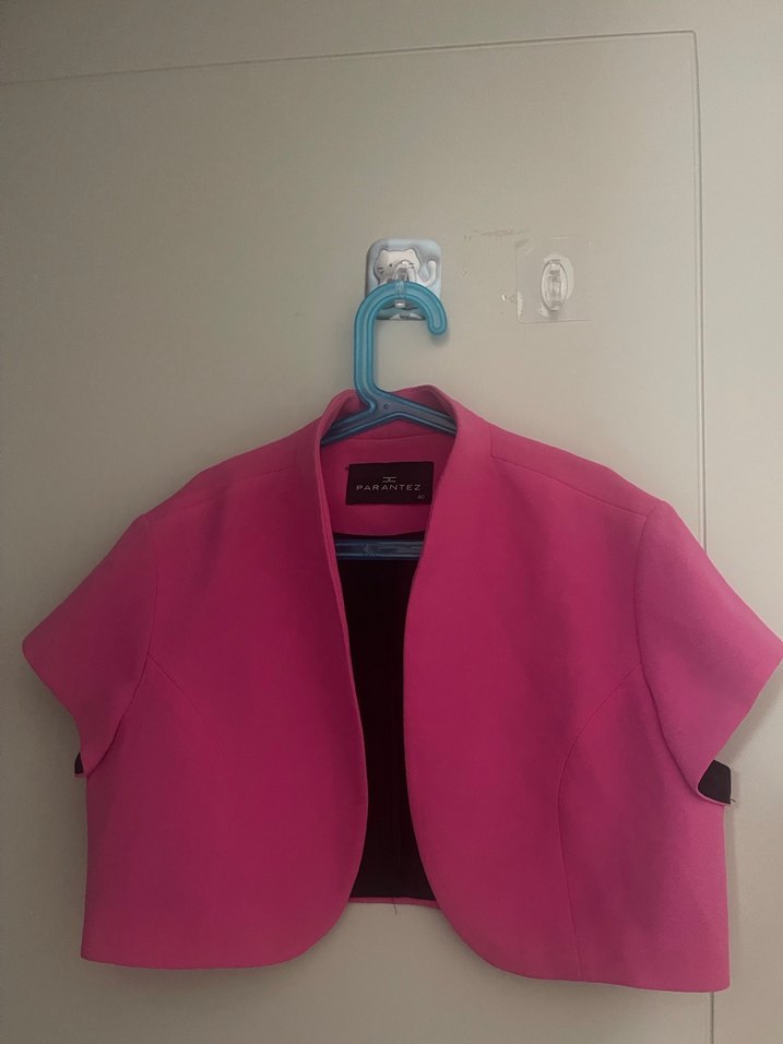 Kız çocuklar için pembe, kısa kollu, düğmeli ve kesimli yakalı, yumuşak ve sıcak kumaştan yapılmış bolero.
