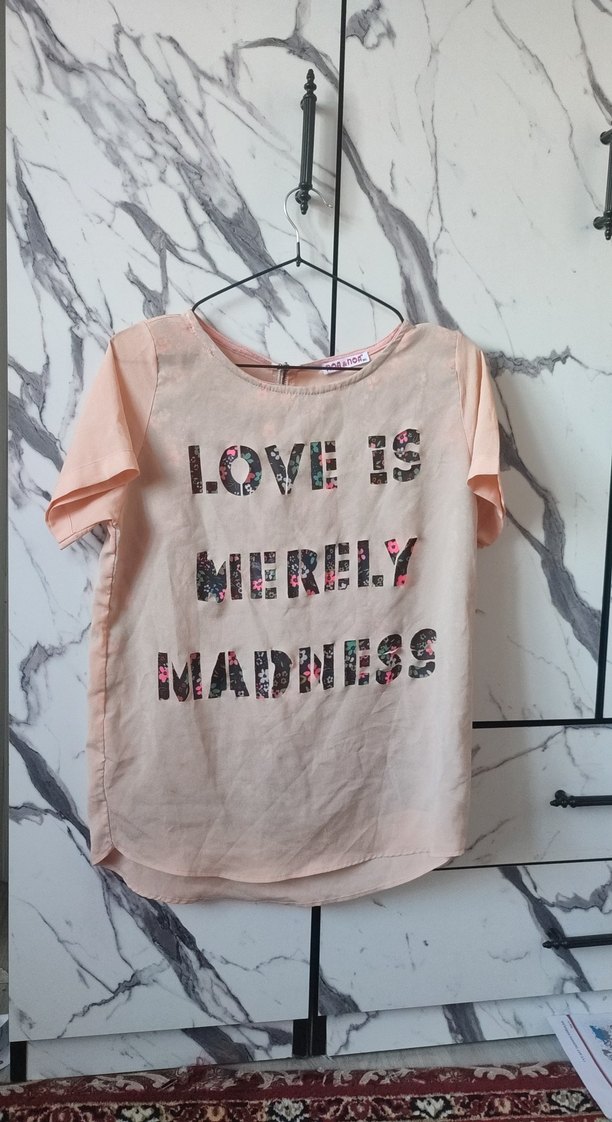 Pembe pastel renkli, keten kumaştan, kısa kollu, yuvarlak yaka, dantel detaylı ve çiçek desenli baskılı yazılı bol kesim kız çocuk tişörtü. Bohem tarzına uygun. M ve L bedene uygun .