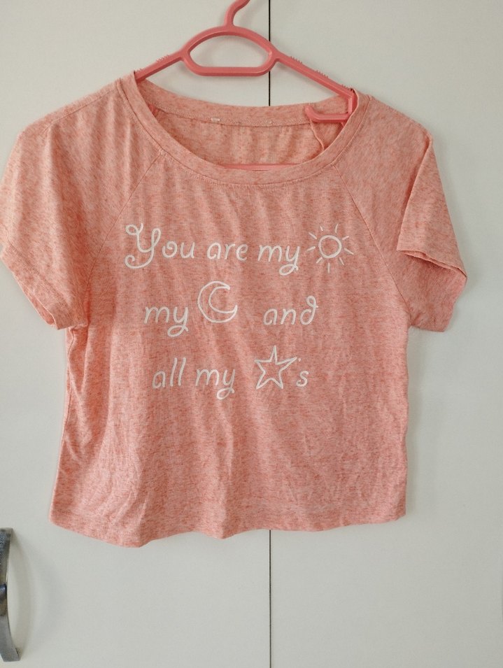 Pamuk kumaştan, kısa kollu, yuvarlak yaka, bol kesim pembe kız tişörtü. Üzerinde "You are my sun, moon, and all my stars" yazılı dantel baskı bulunur.