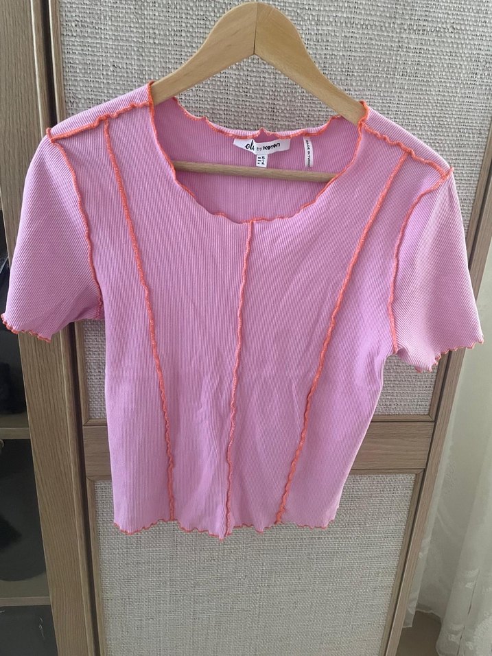 Fitted kesim, kısa kollu ve bisiklet yaka kız çocuk tişörtü, yumuşak keten kumaştan pastel pembe renkte. İnce dikiş detaylarıyla sade ve şık bir görünüm sunar.