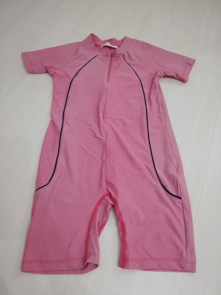 Kız çocuklar için pembe kısa kollu mayo, sade tasarım ve siyah şerit detaylarla rahat kullanım sağlar.