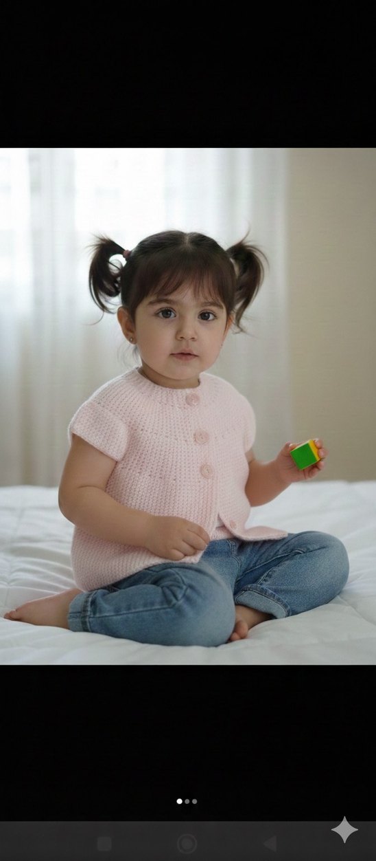 Pastel pembe renkli, kısa kollu, düğmeli ve bol kesim örgü kız bebek yeleği. Desensiz ve normcore tarzda tasarlanmıştır.