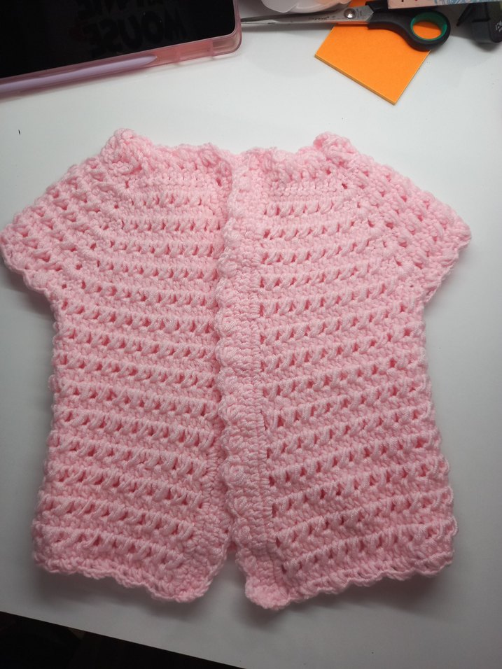 Kız çocuklar için pembe renkte, kısa kollu ve örgü kumaştan yapılmış, sade ve fitted kesim hırka. Yeğenim için kendim ördüm. İsteyene istediği renkte ve ipte örebilirim. Eğitimime katkısı olsun diye yapıyorum.