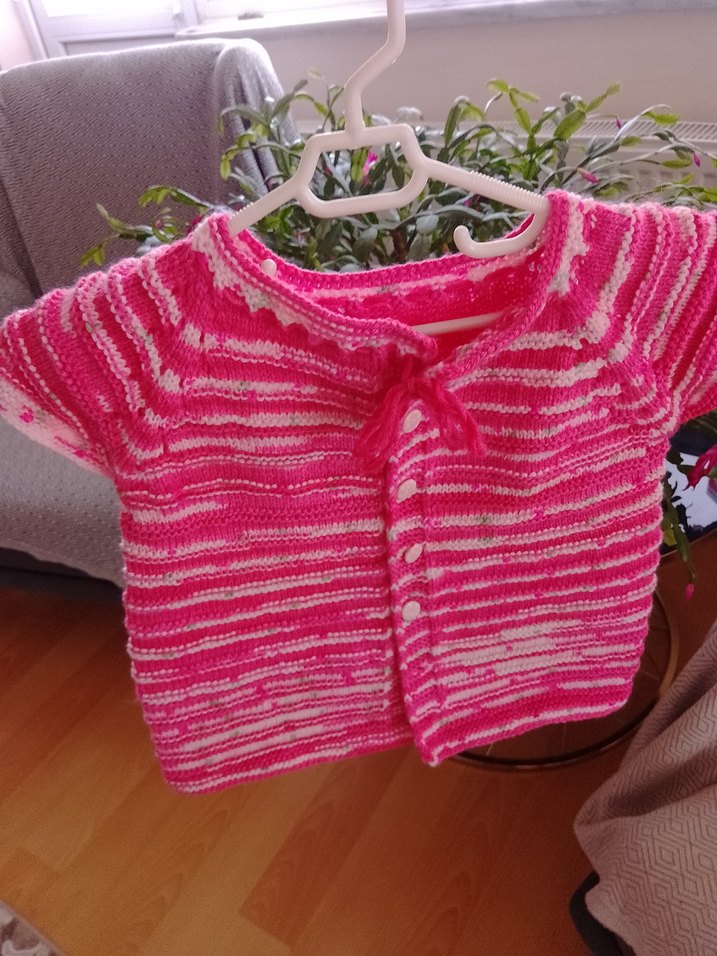 Canlı pembe renkli, kısa kollu, örgü ve bağcıklı ön tasarıma sahip bohem tarzda kız çocuk hırkası.