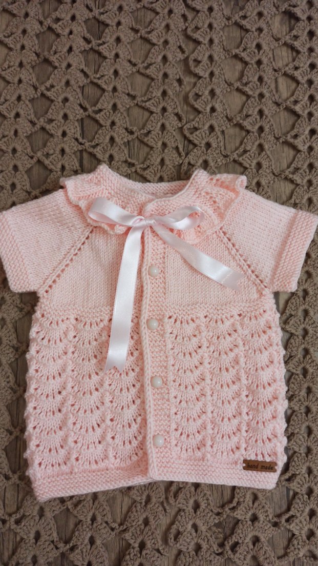 Pembe pastel renkte, kısa kollu ve bol kesim vintage tarzı örgü kız çocuk hırkası, yakasında kurdele detayı bulunur.