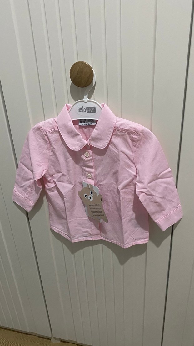 Kız çocukları için kısa kollu, yakalı ve düğmeli pamuklu gömlek. Pastel pembe renkte, normal kesim ve desensiz sadelik sunar.