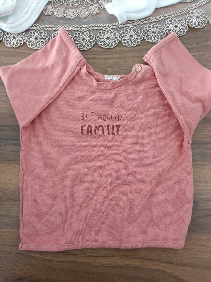 Pembe renkli, pamuklu kumaştan yapılmış, kısa kollu ve yuvarlak yakalı bol kesim kız çocuk tişörtü. Üzerinde 'FAMILY, BUT ALWAYS' baskısı ve düğme detayı bulunur.