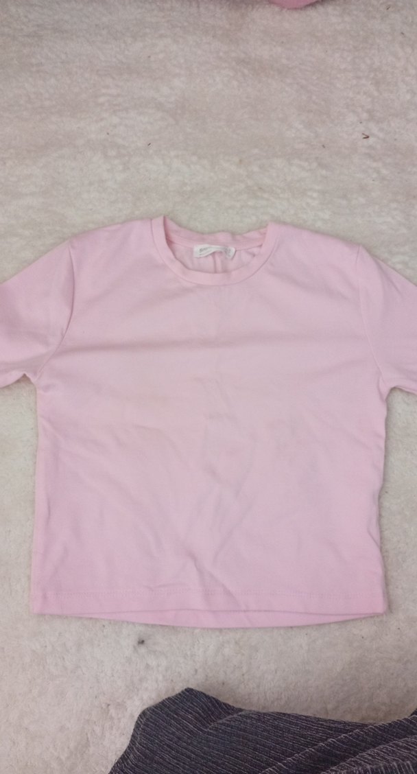Pamuklu kumaştan yapılmış, kısa kollu ve bisiklet yaka, pastel pembe renkli kız çocuk tişörtü. Normcore tarzda, sade ve şık görünümlü.