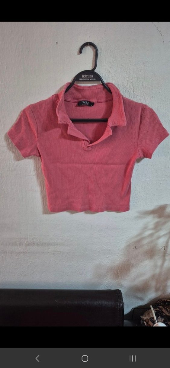 Pastel pembe renkte, kısa kollu ve yakalı, düğmeli kız çocuk polo tişörtü. Yumuşak sentetik kumaştan, trend sokak stili için uygun.