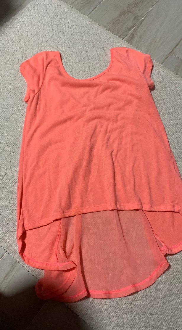 Pastel pembe renkli, kısa kollu, yuvarlak yakalı ve salaş kesimli kız çocuk tişörtü. Yumuşak sentetik kumaştan, drapeli ve normcore tarzda.