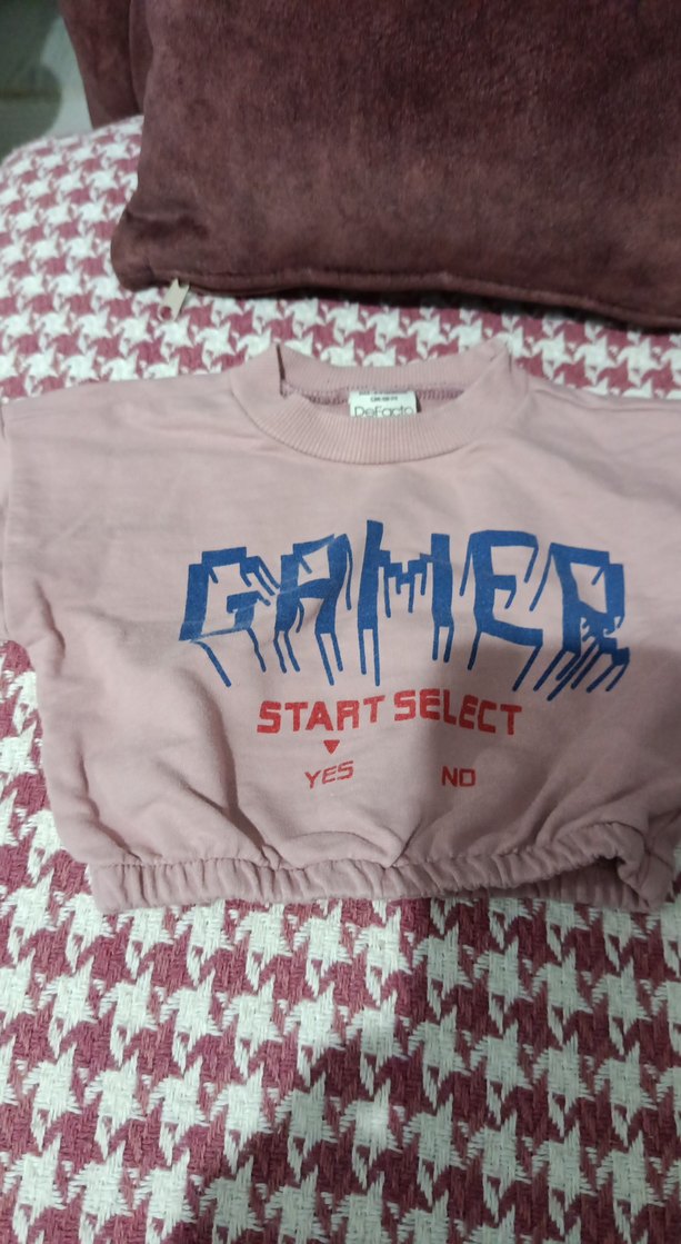 Pembe renkli kız çocuk sweatshirt, kısa kollu ve bisiklet yaka. Pamuklu, örgü dokulu, gevşek kesim ve oyun temalı baskılı desenli. Trend sokak stili için uygun.