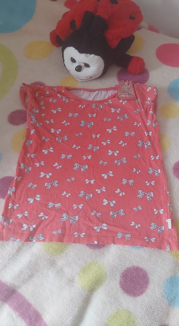 Pembe renkli kız çocuk tişörtü, kısa kollu ve bol kesimdir. Yuvarlak yakalı, baskılı fiyonk desenli ve omuzda ekstra fiyonk detayına sahiptir. Yumuşak sentetik kumaştan üretilmiştir.